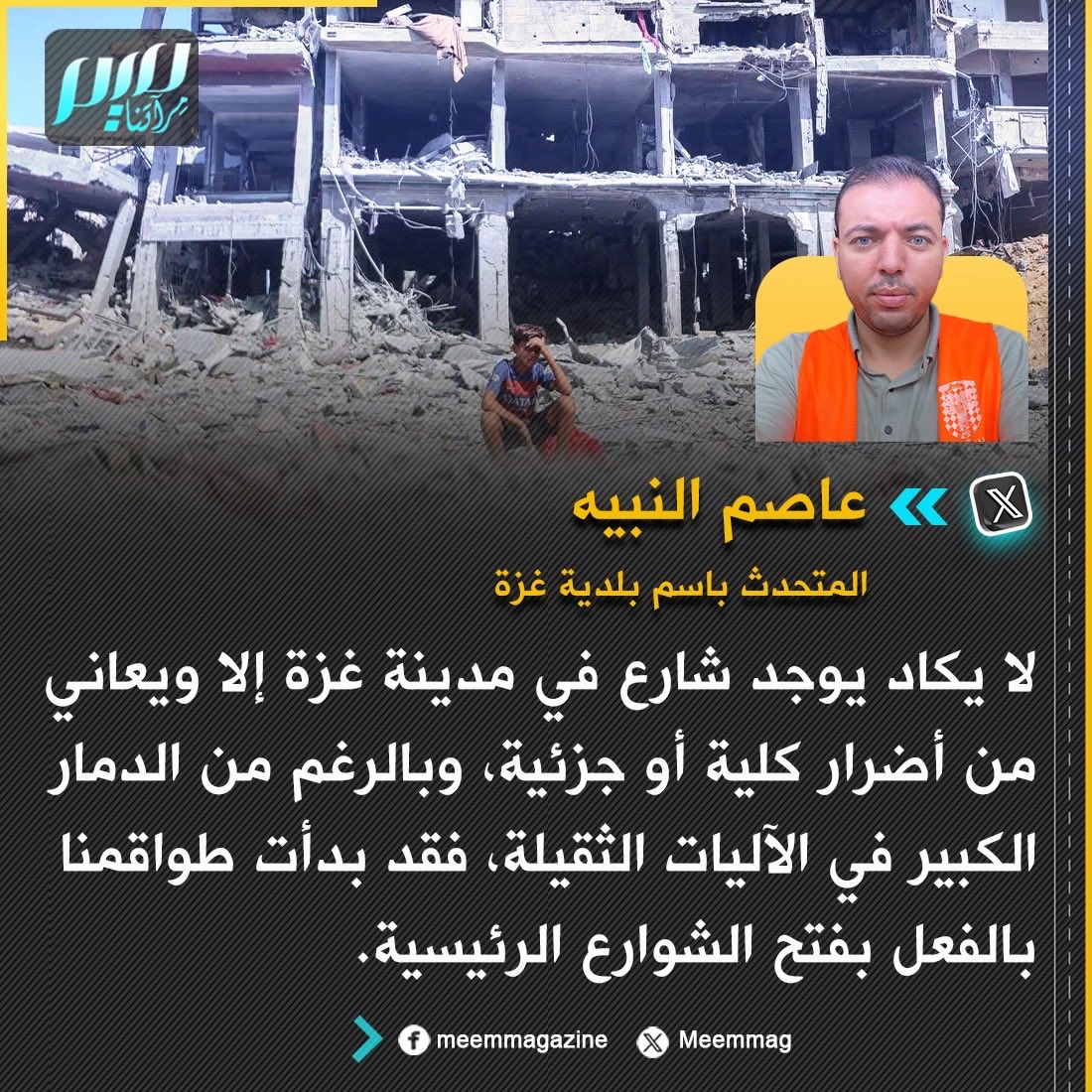 المتحدث باسم بلدية غزة: لا يكاد يوجد شارع في مدينة غزة إلا ويعاني من أضرار كلية أو جزئية، وبالرغم من الدمار الكبير في الآليات الثقيلة، فقد بدأت طواقمنا بالفعل بفتح الشوارع الرئيسية.