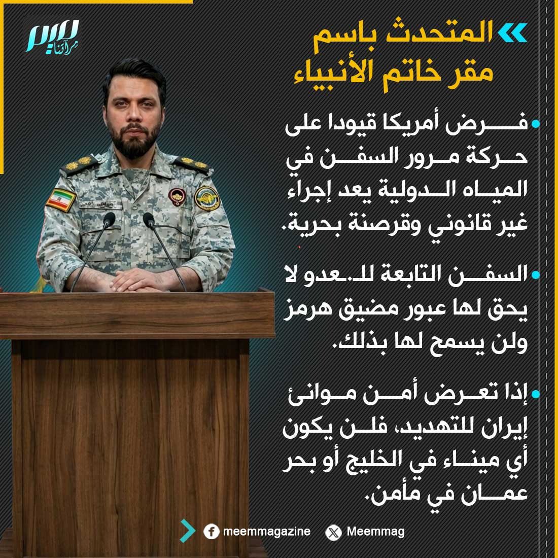 المتحدث باسم مقر خاتم الأنبياء: إذا تعرض أمن موانئ إيران للتهديد، فلن يكون أي ميناء في الخليج أو بحر عمان في مأمن
