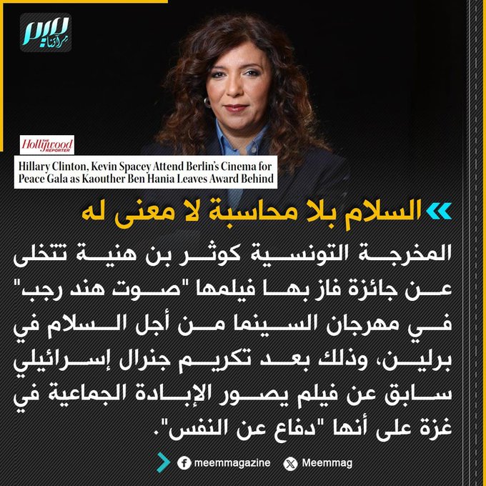 المخرجة التونسية كوثر بن هنية تتخلى عن جائزة فاز بها فيلمها "صوت هند رجب" في مهرجان السينما من أجل السلام في برلين، وذلك بعد تكريم جنرال إسرائيلي سابق عن فيلم يصور الإبادة الجماعية في غزة على أنها "دفاع عن النفس".