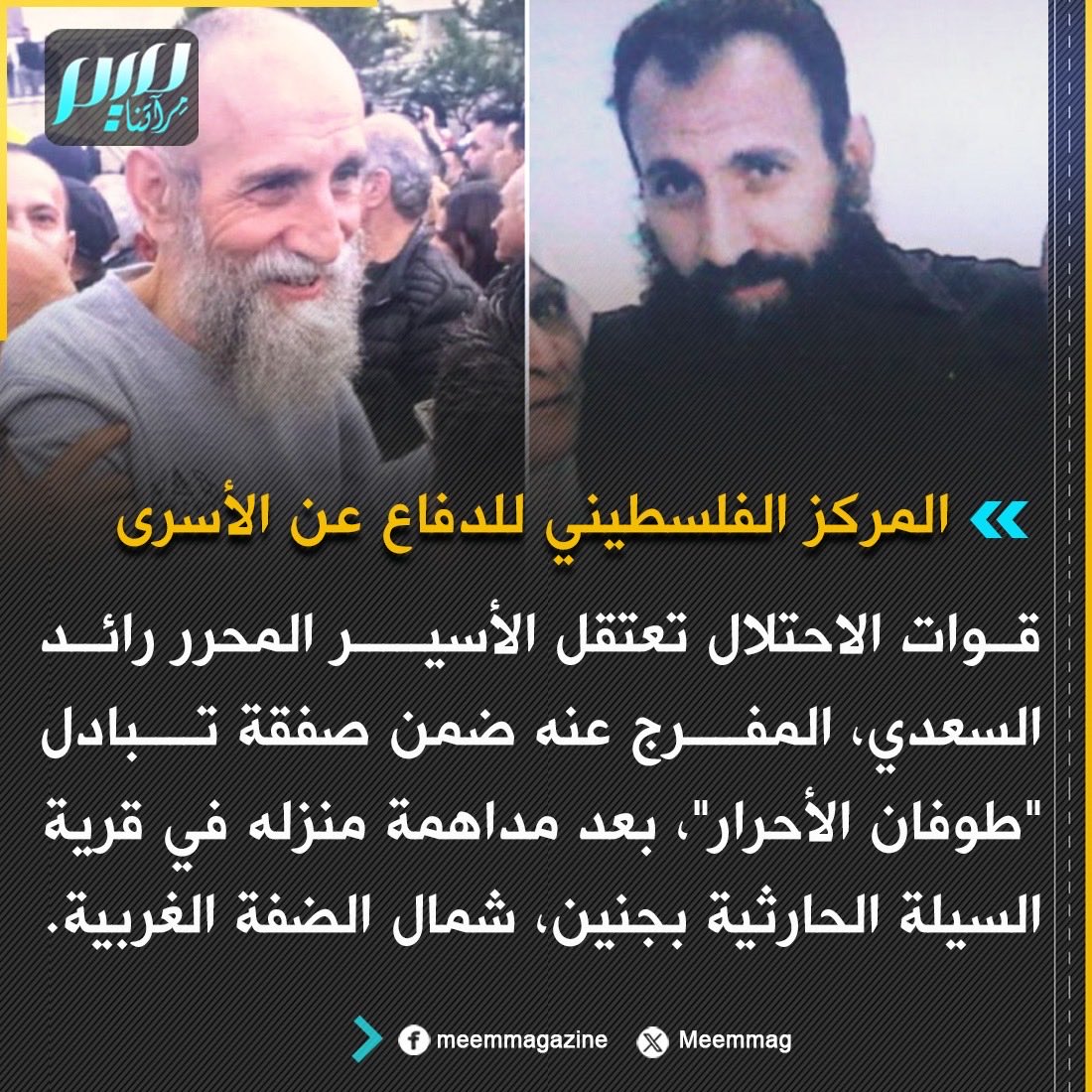 المركز الفلسطيني للدفاع عن الأسرى: قوات الاحتلال تعتقل الأسير المحرر رائد السعدي، المفرج عنه ضمن صفقة تبادل "طوفان الأحرار".
