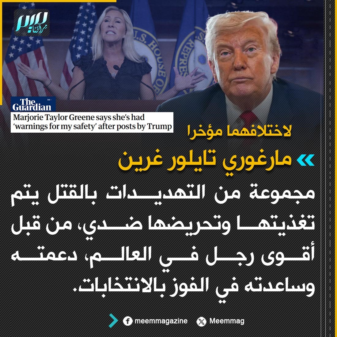 لاختلافهما مؤخرا.. النائبة الأمريكية مارغوري تايلور غرين: مجموعة من التهديدات بالقتل يتم تغذيتها وتحريضها ضدي، من قبل أقوى رجل في العالم، دعمته وساعدته في الفوز بالانتخابات.