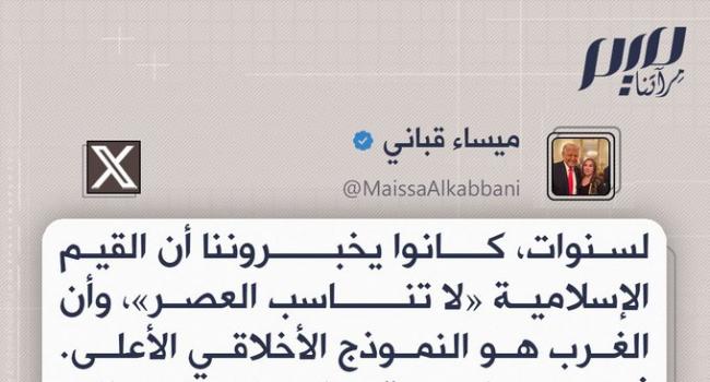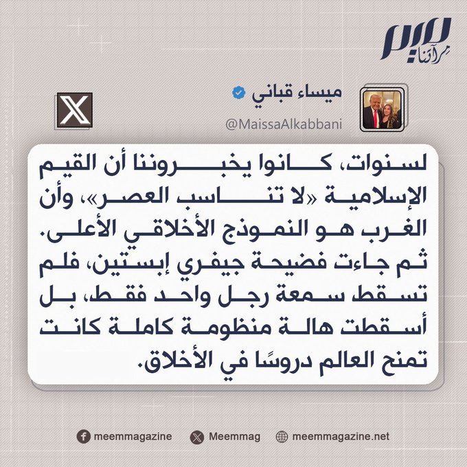 الناشطة السورية ميساء قباني: لسنوات، كانوا يخبروننا أن القيم الإسلامية "لا تناسب العصر"، وأن الغرب هو النموذج الأخلاقي الأعلى. ثم جاءت فضيحة جيفري إبستين، فلم تسقط سمعة رجل واحد فقط، بل أسقطت هالة منظومة كاملة كانت تمنح العالم دروسًا في الأخلاق.