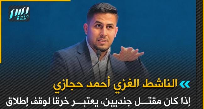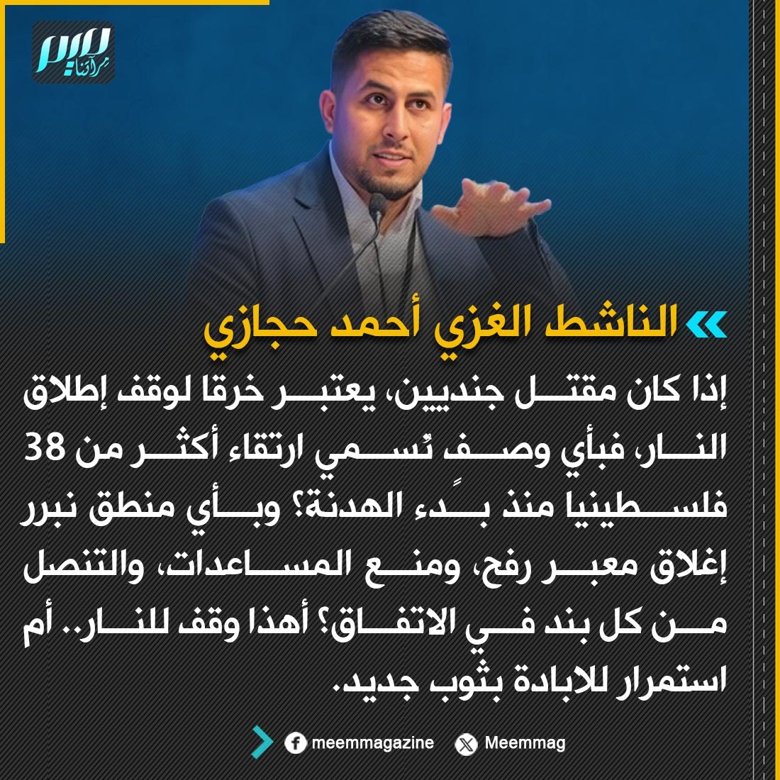 الناشط الغزي أحمد حجازي: إذا كان مقتل جنديين، يعتبر خرقا لوقف إطلاق النار، فبأي وصفٍ نُسمي ارتقاء أكثر من 38 فلسطينيا منذ بدء الهدنة؟