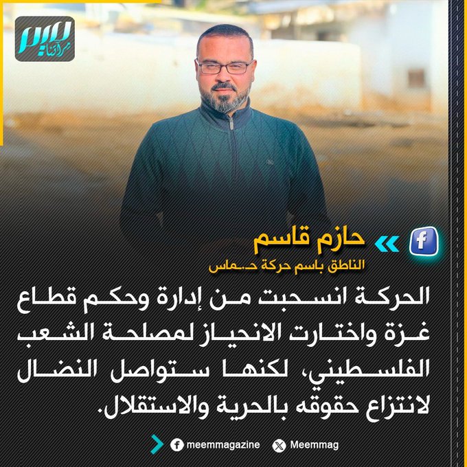 الناطق باسم حمـ.ـاس يعلن رسميا انسحاب الحركة من إدارة وحكم قطاع غزة.