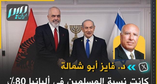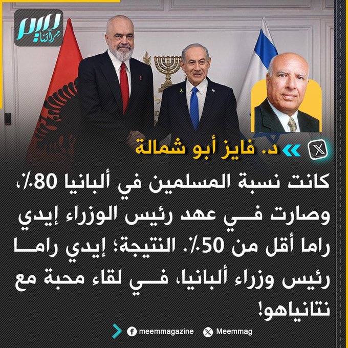 الكاتب والسياسي فايز أبو شمالة: كانت نسبة المسلمين في ألبانيا 80%، وصارت في عهد رئيس الوزراء إيدي راما أقل من 50%. النتيجة؛ إيدي راما رئيس وزراء ألبانيا، في لقاء محبة مع نتانياهو!
