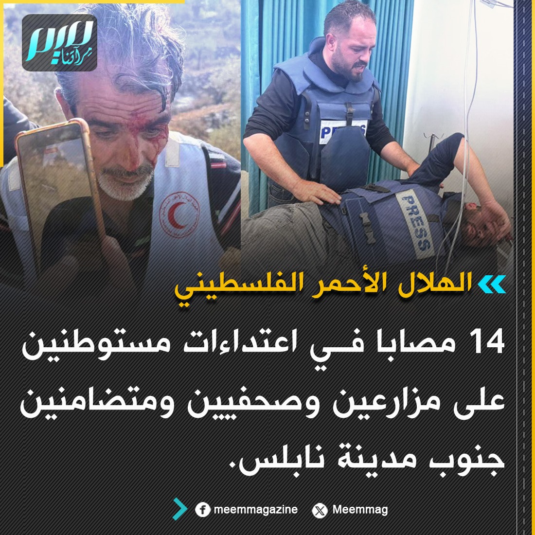 الهلال الأحمر الفلسطيني: 14 مصابا في اعتداءات مستوطنين على مزارعين وصحفيين ومتضامنين جنوب مدينة نابلس.