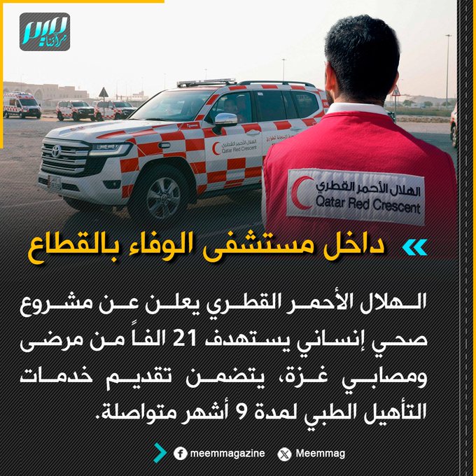 الهلال الأحمر القطري يعلن عن مشروع صحي إنساني يستهدف 21 الفاً من مرضى ومصابي غزة، يتضمن تقديم خدمات التأهيل الطبي لمدة 9 أشهر متواصلة.