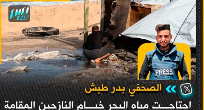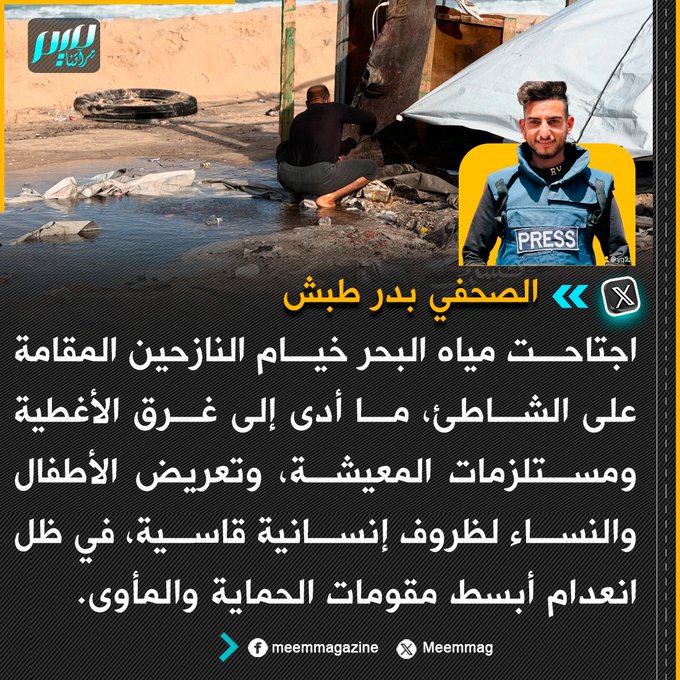 بدر طبش: اجتاحت مياه البحر خيام النازحين المقامة على الشاطئ، ما أدى إلى غرق الأغطية ومستلزمات المعيشة، وتعريض الأطفال والنساء لظروف إنسانية قاسية، في ظل انعدام أبسط مقومات الحماية والمأوى.
