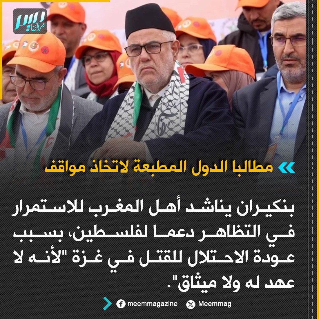 بنكيران يناشد أهل المغرب للاستمرار في التظاهر دعما لفلسطين، بسبب عودة الاحتلال للقتل في غزة "لأنه لا عهد له ولا ميثاق".