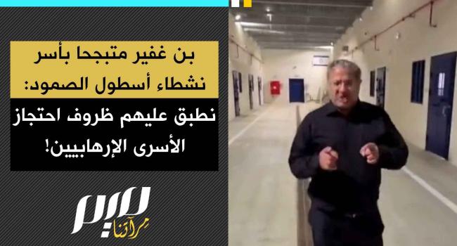 في خطاب مليء بالتشفي، ظهر وزير الأمن القومي الإسرائيلي إيتمار بن غفير متباهيا بأسر نشطاء أسطول الصمود، مؤكدًا أنهم محتجزون في سجن كتسيعوت (النقب) تحت ظروف أقل من "الحد الأدنى"، تماما كما يعامل الأسرى الإرهابيون، وفق توصيفه.