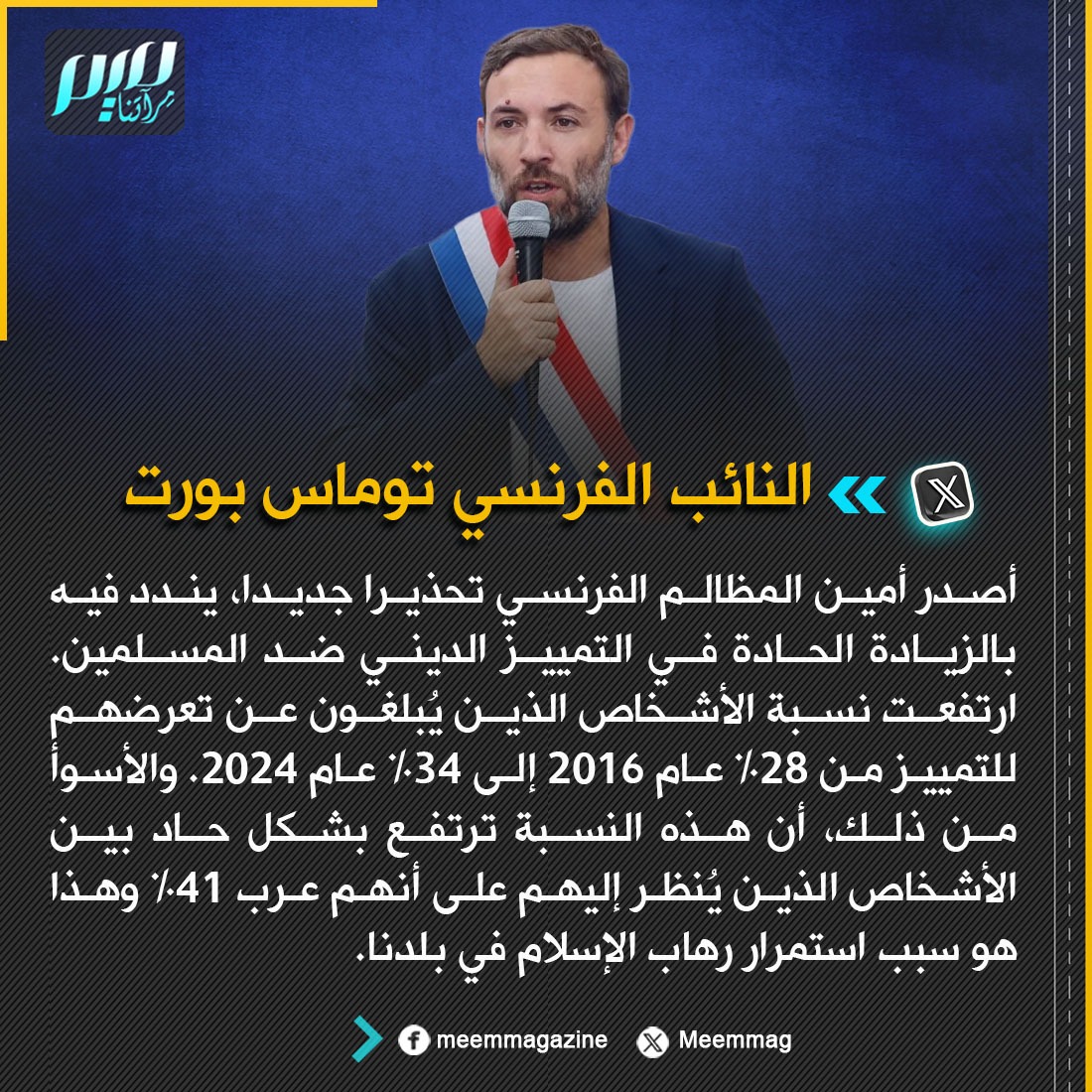 بورت: أصدر أمين المظالم الفرنسي تحذيرا جديدا، يندد فيه بالزيادة الحادة في التمييز الديني ضد المسلمين. ارتفعت نسبة الأشخاص الذين يُبلغون عن تعرضهم للتمييز من ٢٧٪ عام ٢٠١٦ إلى ٣٤٪ عام ٢٠٢٤. والأسوأ من ذلك، أن هذه النسبة ترتفع بشكل حاد بين الأشخاص الذين يُنظر إليهم على أنهم عرب ٤١٪ وهذا هو سبب استمرار رهاب الإسلام في بلدنا.