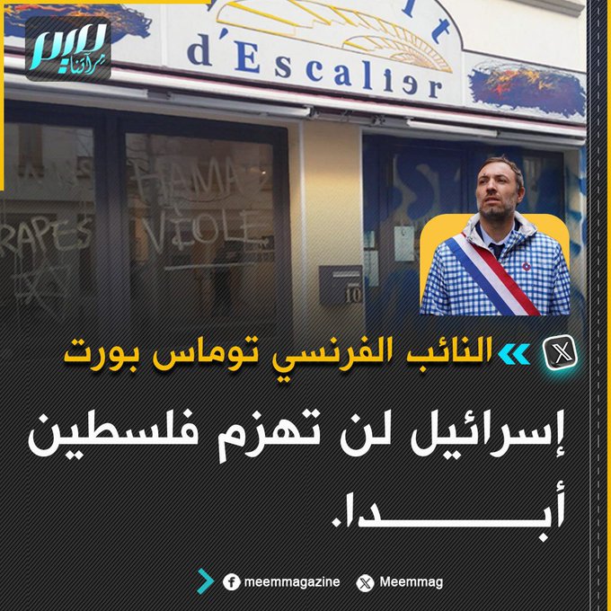 النائب الفرنسي توماس بورت يندد بكتابة أشخاص مؤيدين لإسرائيل عبارة "إسرائيل ستنتصر" على أبواب معرض لأعمال فنية فلسطينية في باريس.