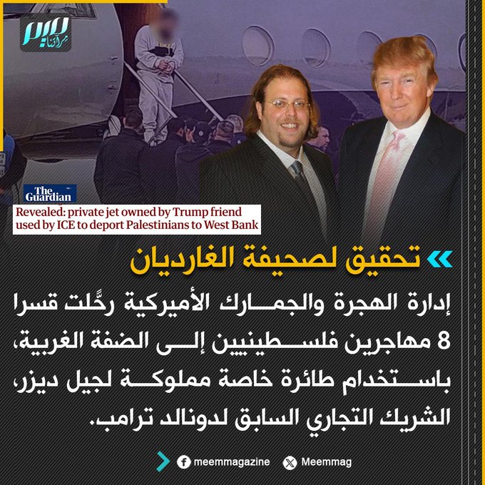 تحقيق لصحيفة الغارديان: إدارة الهجرة والجمارك الأميركية رحّلت قسرًا 8 مهاجرين فلسطينيين إلى الضفة الغربية، باستخدام طائرة خاصة مملوكة لجيل ديزر، الشريك التجاري السابق لدونالد ترامب.