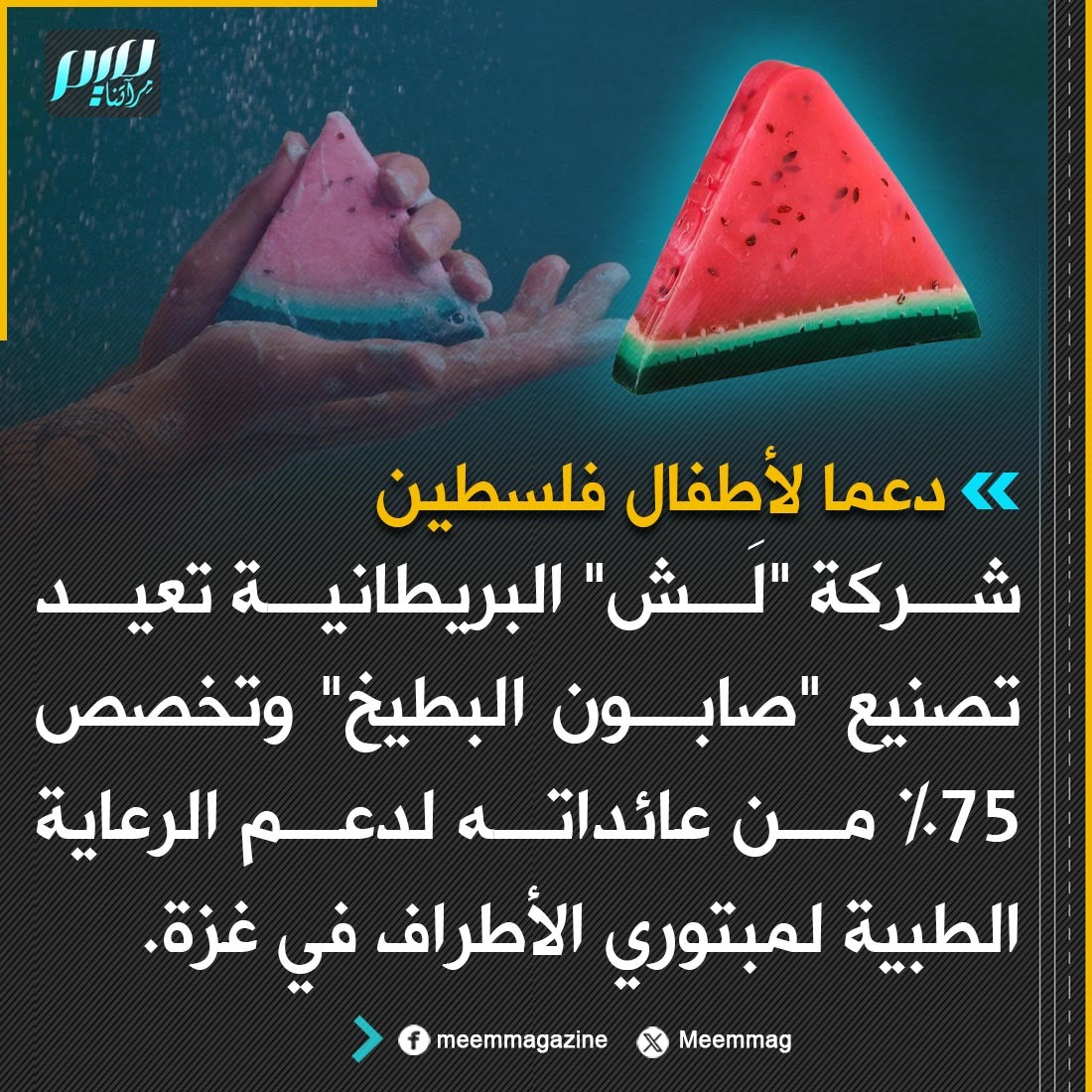 شركة "لَش" البريطانية تعيد تصنيع "صابون البطيخ" وتخصص 75% من عائداته لدعم الرعاية الطبية لمبتوري الأطراف في غزة.