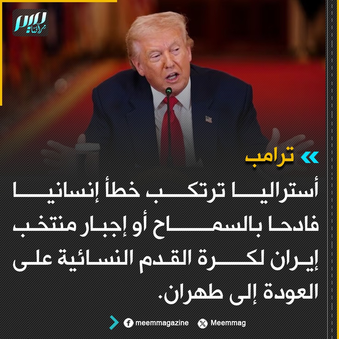 ترامب: أستراليا ترتكب خطأ إنسانيا فادحا بالسماح أو إجبار منتخب إيران لكرة القدم النسائية على العودة إلى طهران