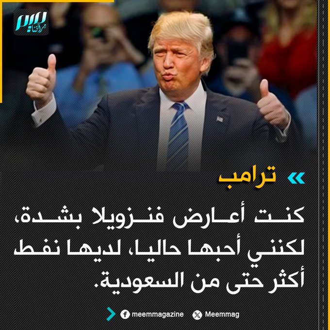 ترامب: كنت أعارض فنزويلا بشدة، لكنني أحبها حاليا، لديها نفط أكثر حتى من السعودية.