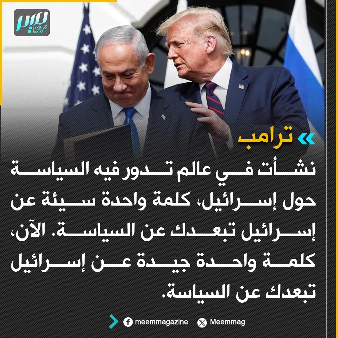 ترامب: نشأت في عالم تدور فيه السياسة حول إسرائيل، كلمة واحدة سيئة عن إسرائيل تبعدك عن السياسة. الآن، كلمة واحدة جيدة عن إسرائيل تبعدك عن السياسة.