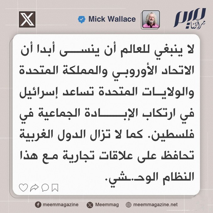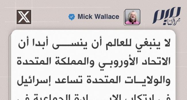 مايك والاس: لا ينبغي للعالم أن ينسى أبدا أن الاتحاد الأوروبي والمملكة المتحدة والولايات المتحدة تساعد إسرائيل في ارتكاب الإبادة الجماعية في فلسطين.