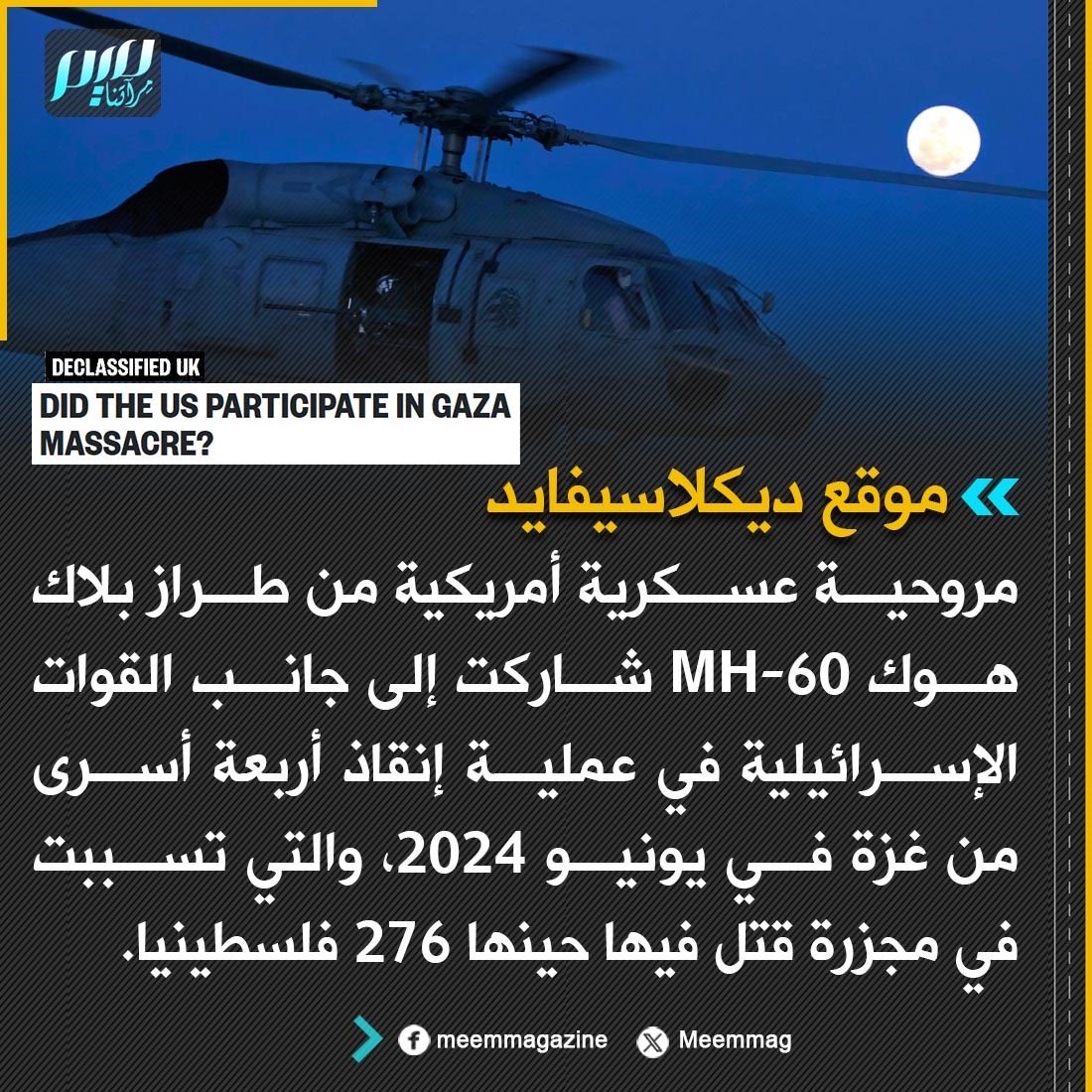 موقع ديكلاسيفايد: مروحية عسكرية أمريكية من طراز بلاك هوك MH-60 شاركت إلى جانب القوات الإسرائيلية في عملية إنقاذ أربعة أسرى من غزة في يونيو 2024، والتي تسببت في مجزرة قتل فيها حينها 276 فلسطينيًا.