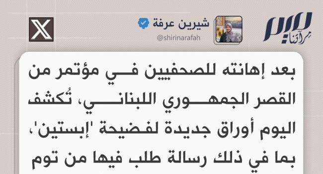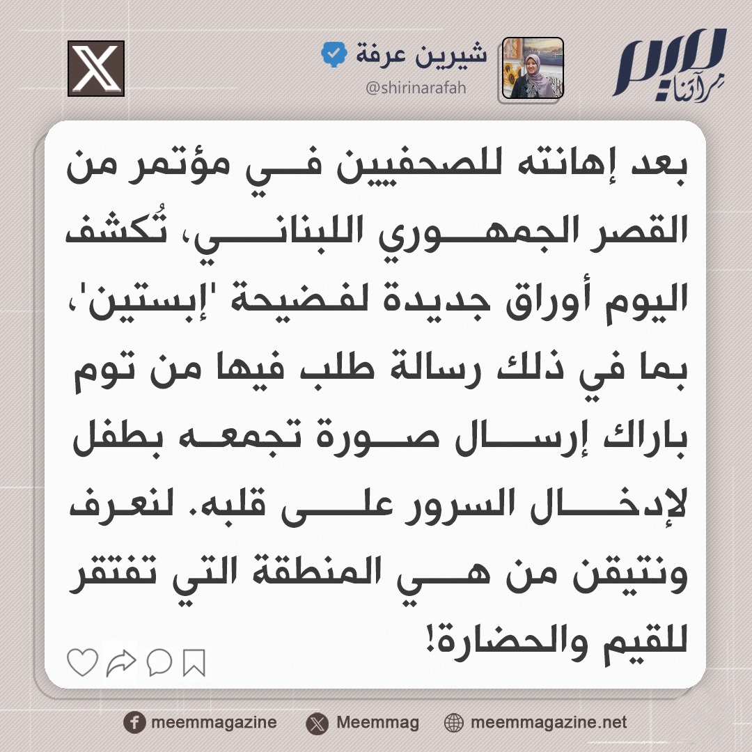 شيرين عرفة: بعد إهانته للصحفيين في مؤتمر من القصر الجمهوري اللبناني، تُكشف اليوم أوراق جديدة لفضيحة 'إبستين'، بما في ذلك رسالة طلب فيها من توم باراك إرسال صورة تجمعه بطفل لإدخال السرور على قلبه. لنعرف ونتيقن من هي المنطقة التي تفتقر للقيم والحضارة!