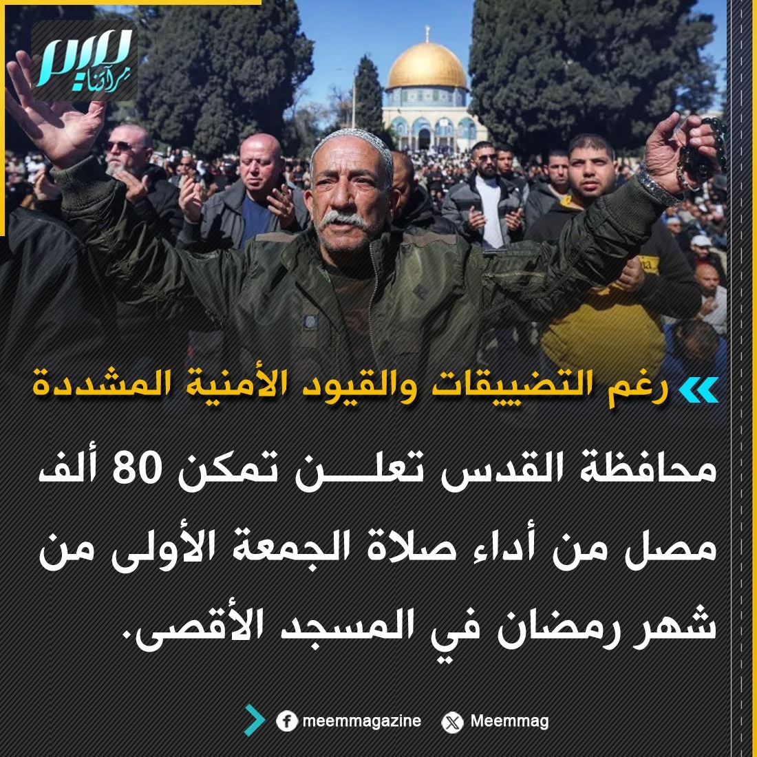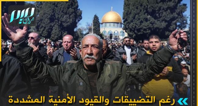 80 ألف مصلٍّ تمكنوا من أداء صلاة الجمعة الأولى من شهر رمضان في المسجد الأقصى، رغم التضييقات والقيود الأمنية المشددة التي فرضتها قوات الاحتلال.