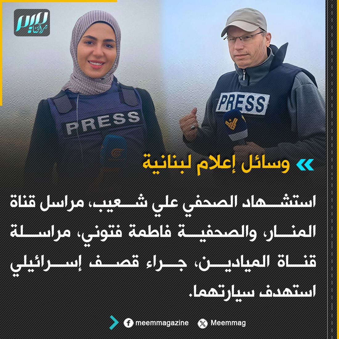 وسائل إعلام لبنانية: استشهاد الصحفي علي شعيب، مراسل قناة المنار، والصحفية فاطمة فتوني، مراسلة قناة الميادين