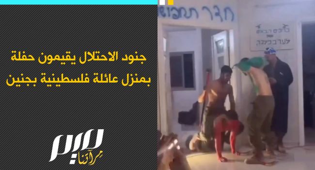 جنود احتلال إسرائيلي من لواء ناحال يقيمون احتفال عيد المساخر "بوريم" في منزل عائلة فلسطينية نازحة بمدينة جنين، شمال الضفة الغربية.