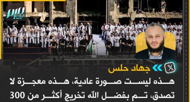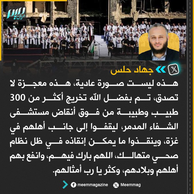 جهاد حلس: هذه ليست صورة عادية، هذه معجزة لا تُصدق، تم بفضل الله تخريج أكثر من 300 طبيب وطبيبة من فوق أنقاض مستشفى الشفاء المدمر، ليقفوا إلى جانب أهلهم في غزة، وينقذوا ما يمكن إنقاذه في ظل نظام صحي متهالك، اللهم بارك فيهم، وانفع بهم أهلهم وبلادهم، وكثر يا رب أمثالهم.