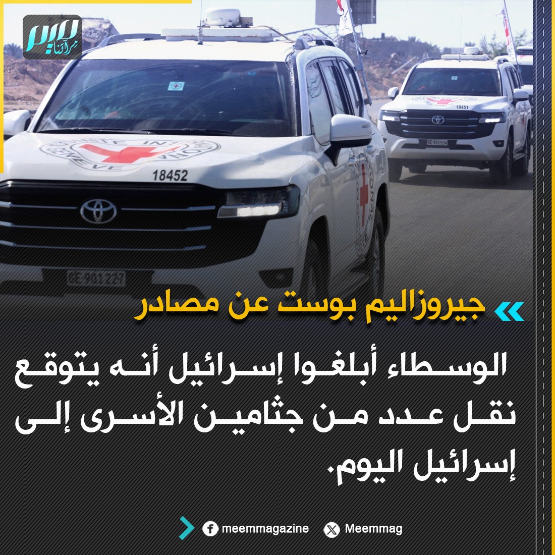 جيروزاليم بوست: الوسطاء أبلغوا إسرائيل أنه يتوقع نقل عدد من جثامين الأسرى إلى إسرائيل اليوم.