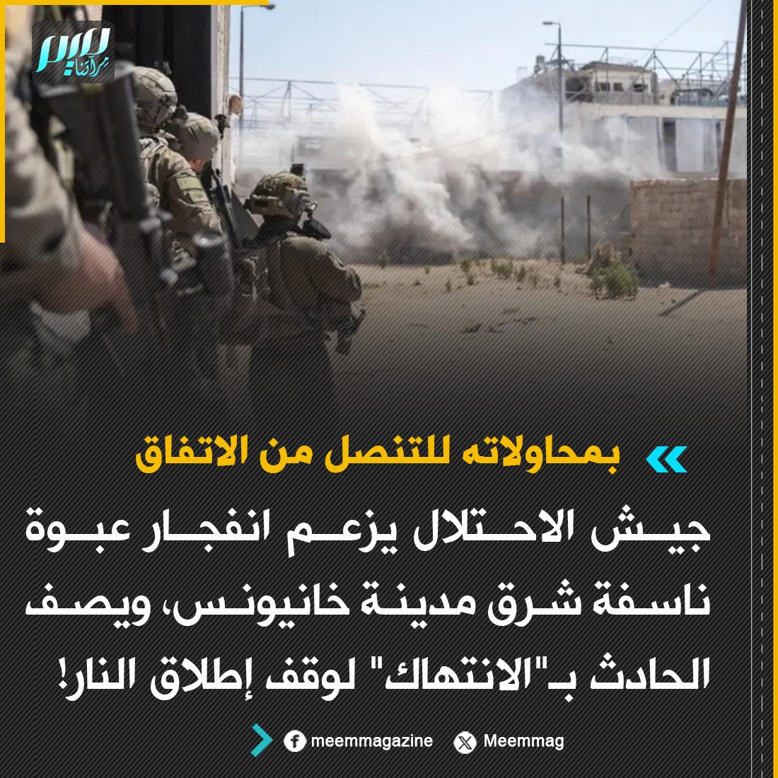 جيش الاحتلال يزعم انفجار عبوة ناسفة شرق مدينة خانيونس، ويصف الحادث بـ"الانتهاك" لوقف إطلاق النار!