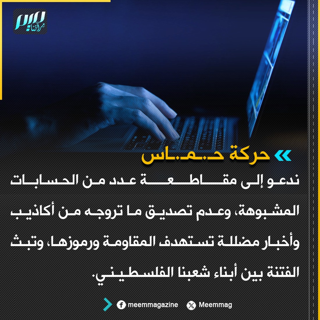 حركة حـ.ـمـ.ـاس: ندعو إلى مقاطعة عدد من الحسابات المشبوهة، وعدم تصديق ما تروجه من أكاذيب وأخبار مضللة تستهدف المقاومة ورموزها، وتبث الفتنة بين أبناء شعبنا الفلسطيني.