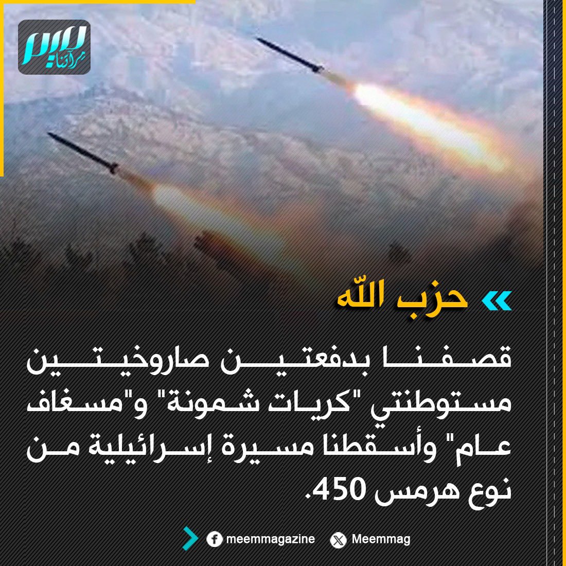 حزب الله: قصفنا بدفعتين صاروخيتين مستوطنتي "كريات شمونة" و"مسغاف عام" وأسقطنا مسيرة إسرائيلية من نوع هرمس 450.