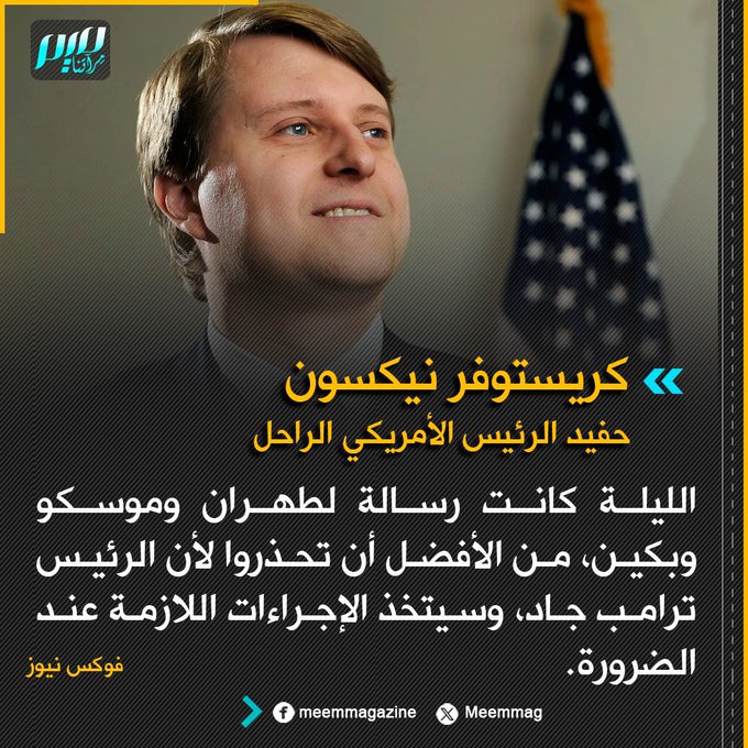 حفيد الرئيس الأمريكي الراحل نيكسون: الليلة كانت رسالة لطهران وموسكو وبكين، من الأفضل أن تحذروا لأن الرئيس ترامب جاد، وسيتخذ الإجراءات اللازمة عند الضرورة.