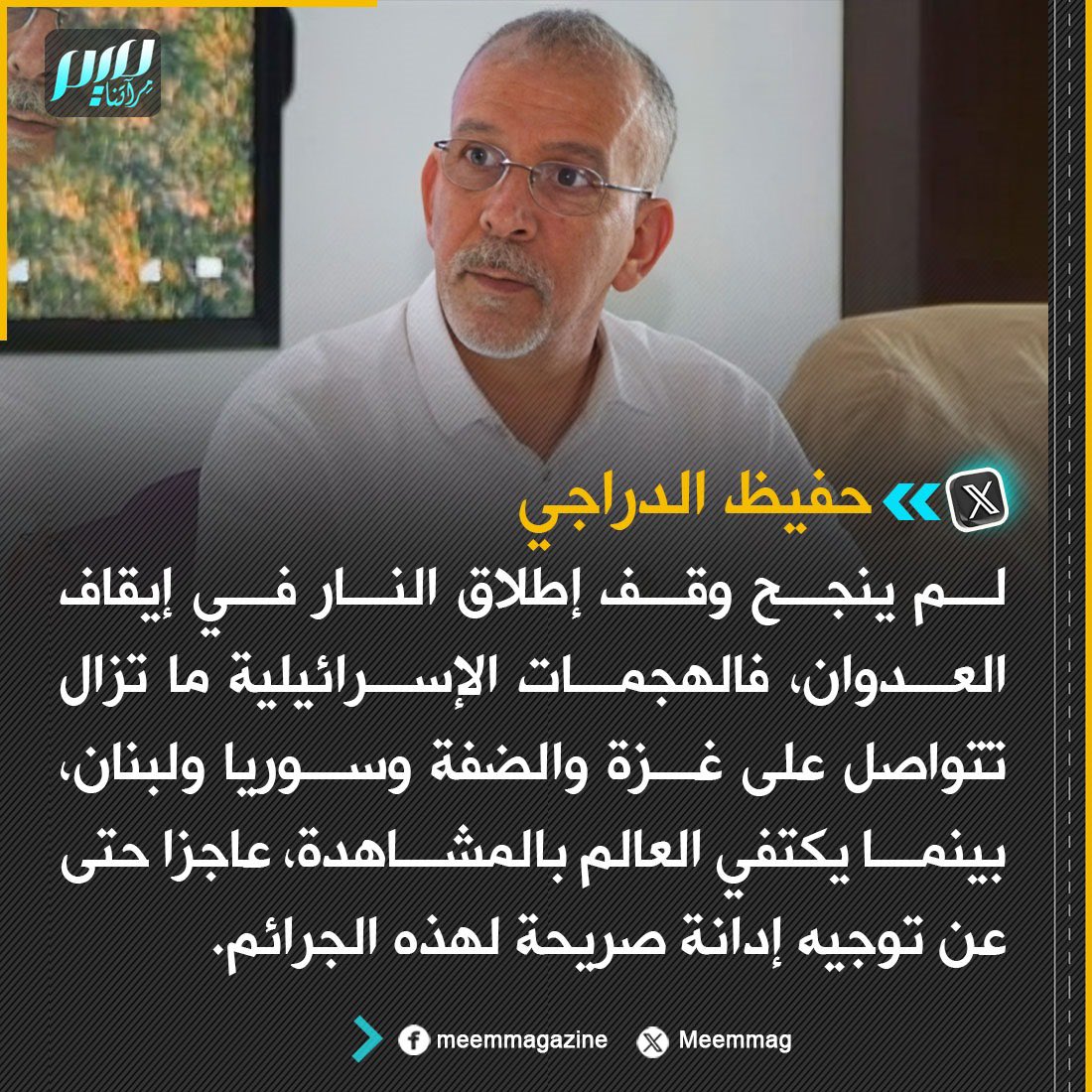 حفيظ الدراجي: لم ينجح وقف إطلاق النار في إيقاف العدوان، فالهجمات الإسرائيلية ما تزال تتواصل على غزة والضفة وسوريا ولبنان، بينما يكتفي العالم بالمشاهدة، عاجزا حتى عن توجيه إدانة صريحة لهذه الجرائم.