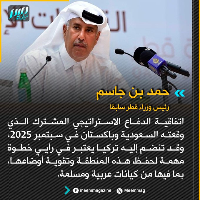حمد بن جاسم: اتفاقية الدفاع الاستراتيجي المشترك الذي وقعته السعودية وباكستان في سبتمبر 2025، وقد تنضم إليه تركيا يعتبر في رأيي خطوة مهمة لحفظ هذه المنطقة وتقوية أوضاعها، بما فيها من كيانات عربية ومسلمة.
