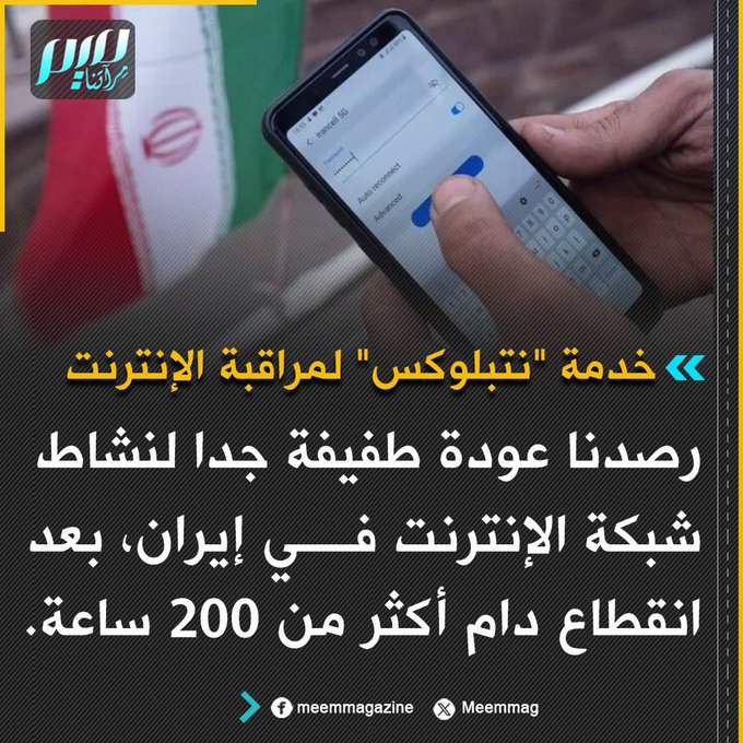 خدمة "نتبلوكس" لمراقبة الإنترنت: رصدنا عودة طفيفة جدا لنشاط شبكة الإنترنت في إيران، بعد انقطاع دام أكثر من 200 ساعة.