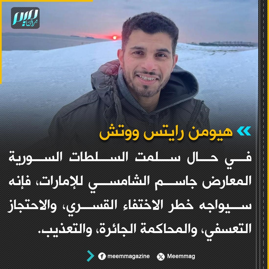 هيومن رايتس ووتش: في حال سلمت السلطات السورية المعارض جاسم الشامسي للإمارات، فإنه سيواجه خطر الاختفاء القسري، والاحتجاز التعسفي، والمحاكمة الجائرة، والتعـ ـذيب.