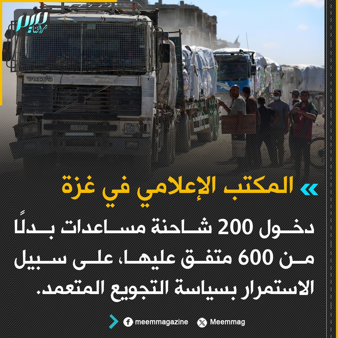المكتب الإعلامي في غزة: دخول 200 شاحنة مساعدات بدلًا من 600 متفق عليها، على سبيل الاستمرار بسياسة التجويع المتعمد.