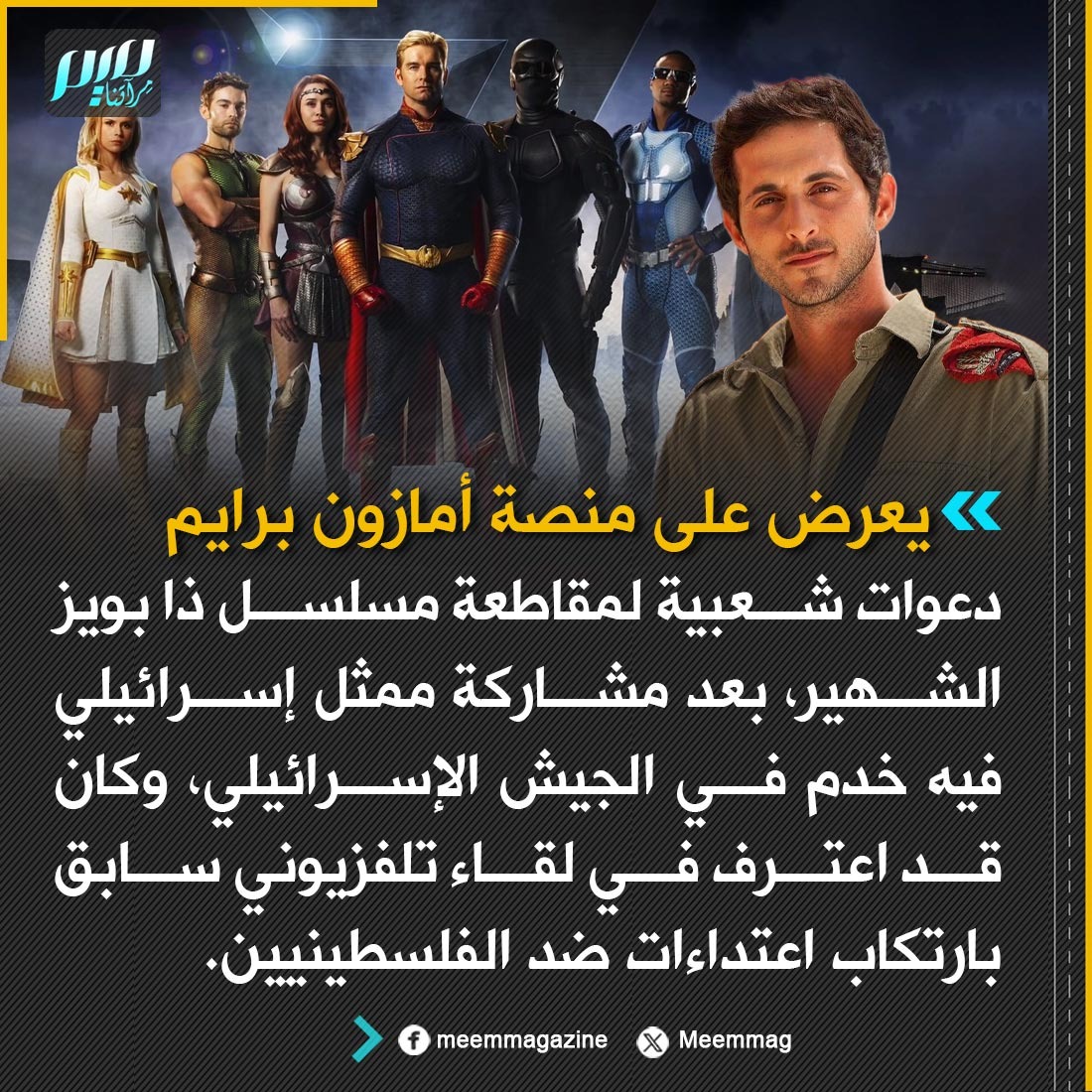 دعوات شعبية لمقاطعة مسلسل "ذا بويز" الشهير، بعد مشاركة ممثل إسرائيلي فيه خدم في الجيش الإسرائيلي، وكان قد اعترف في لقاء تلفزيوني سابق بارتكاب اعتداءات ضد الفلسطينيين.