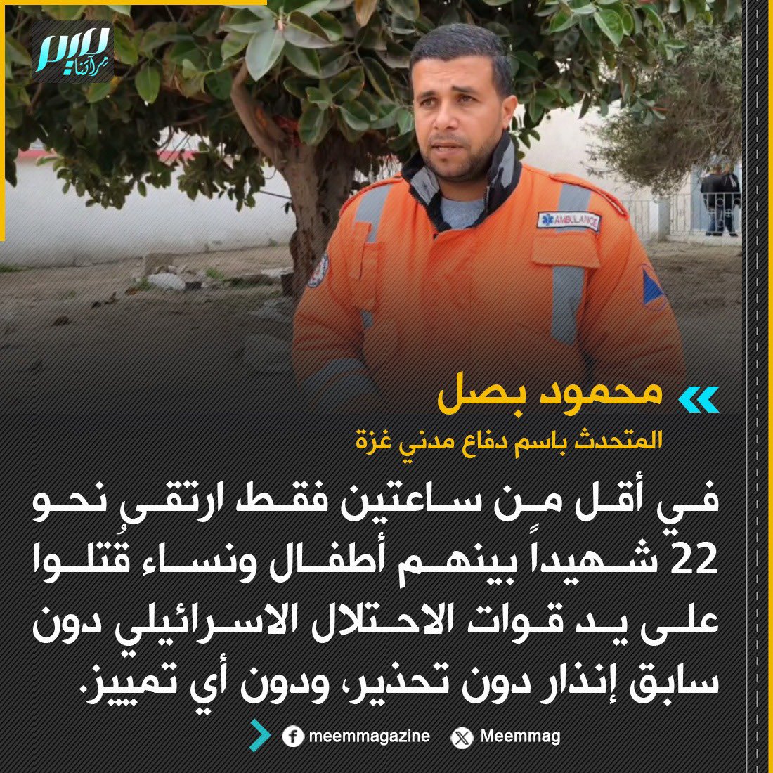 دفاع مدني غزة: في أقل من ساعتين فقط ارتقى نحو 22 شهيداً بينهم أطفال ونساء قُتلوا على يد قوات الاحتلال الاسرائيلي دون سابق إنذار دون تحذير، ودون أي تمييز.