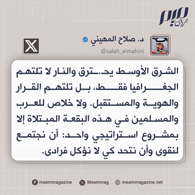 د. صلاح المهيني: لا خلاص للعرب والمسلمين في هذه البقعة المبتلاة إلا بمشروع استراتيجي واحد: أن نجتمع لنقوى وأن نتحد كي لا نؤكل فرادى.