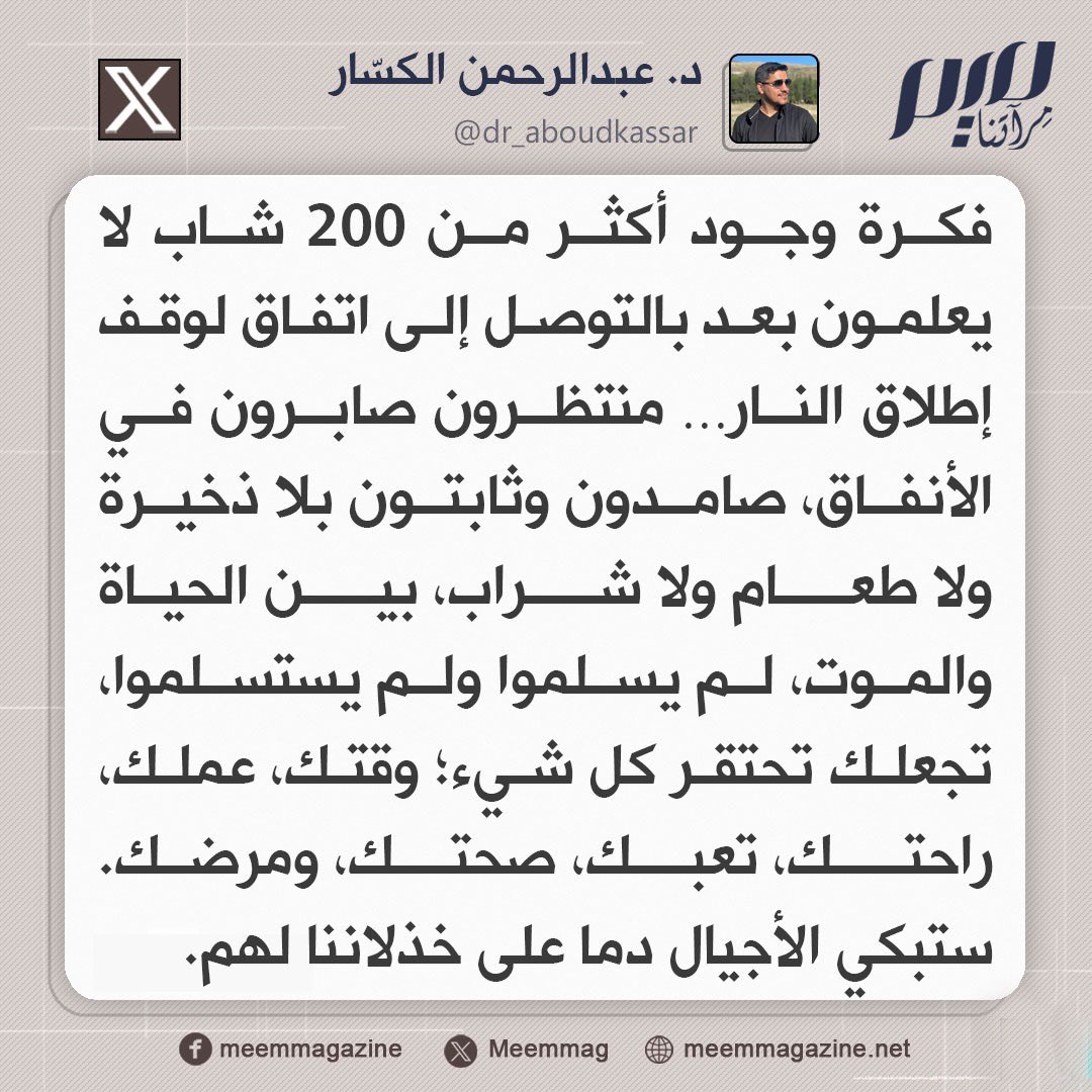 د. عبد الرحمان الكسار: فكرة وجود أكثر من 200 شاب لا يعلمون بعد بالتوصل إلى اتفاق لوقف إطلاق النار