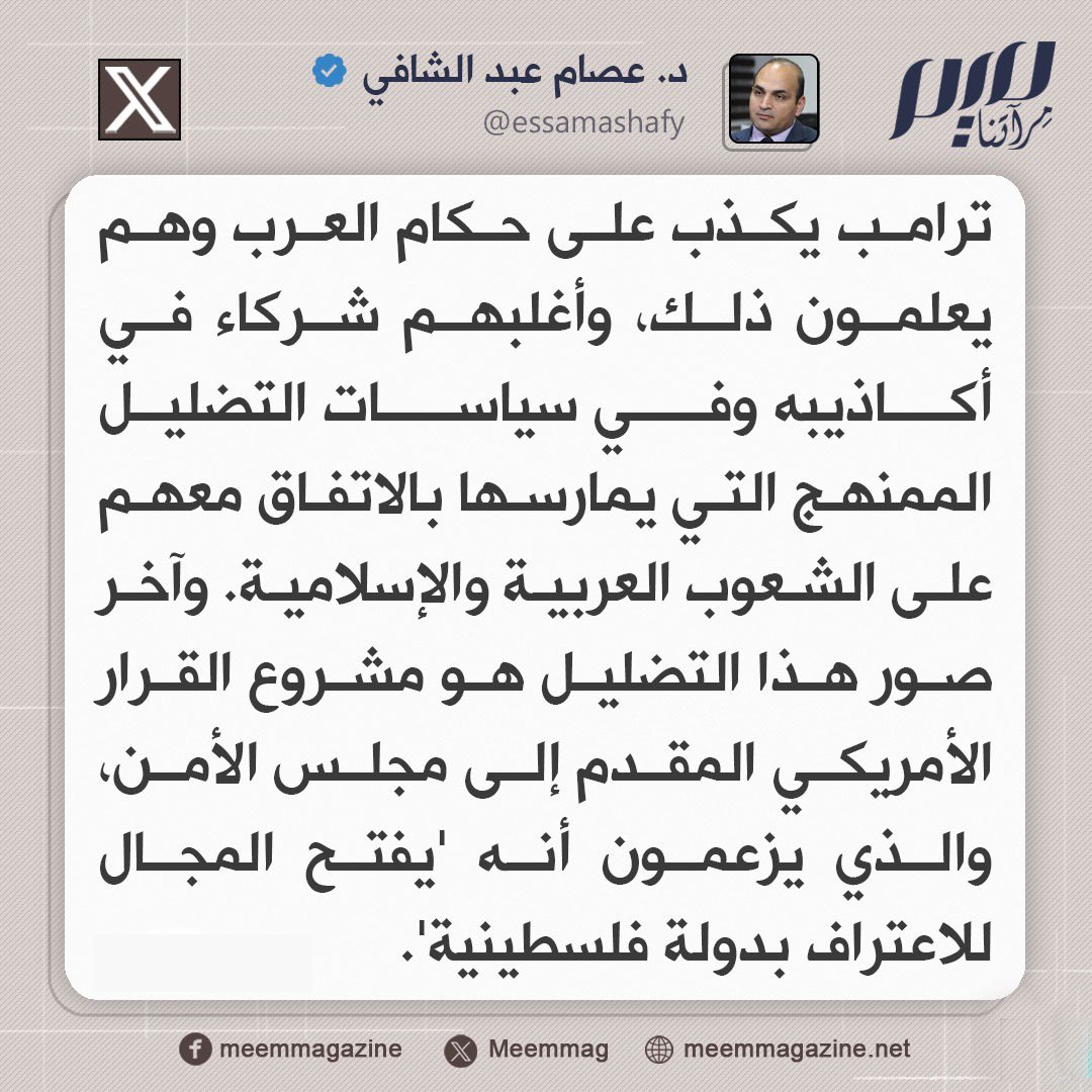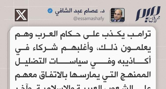 د. عصام عبد الشافي: ترامب يكذب على حكام العرب وهم يعلمون ذلك، وأغلبهم شركاء في أكاذيبه وفي سياسات التضليل الممنهج التي يمارسها بالاتفاق معهم على الشعوب العربية والإسلامية.
