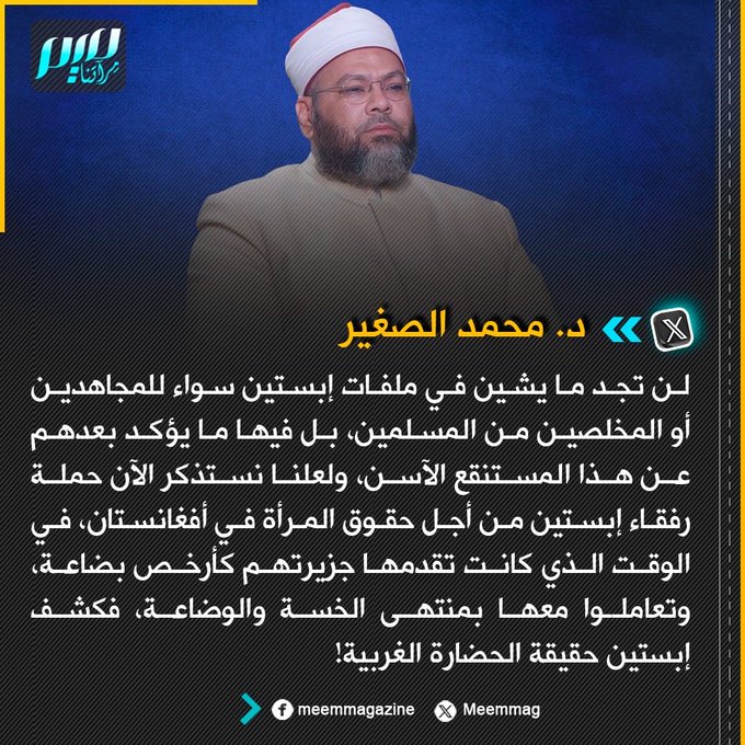 د. محمد الصغير: لن تجد ما يشين في ملفات إبستين سواء للمجاهدين أو المخلصين من المسلمين، بل فيها ما يؤكد بعدهم عن هذا المستنقع الآسن، ولعلنا نستذكر الآن حملة رفقاء إبستين من أجل حقوق المرأة في أفغانستان، في الوقت الذي كانت تقدمها جزيرتهم كأرخص بضاعة، وتعاملوا معها بمنتهى الخسة