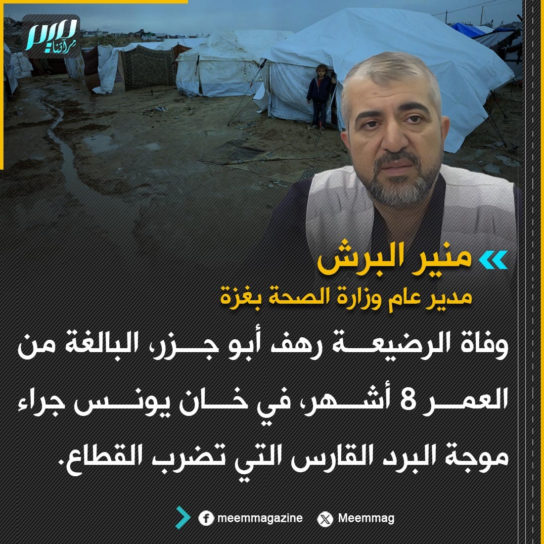 د. منير البرش: وفاة الرضيعة رهف أبو جزر، البالغة من العمر 8 أشهر، في خان يونس جراء موجة البرد القارس التي تضرب القطاع.