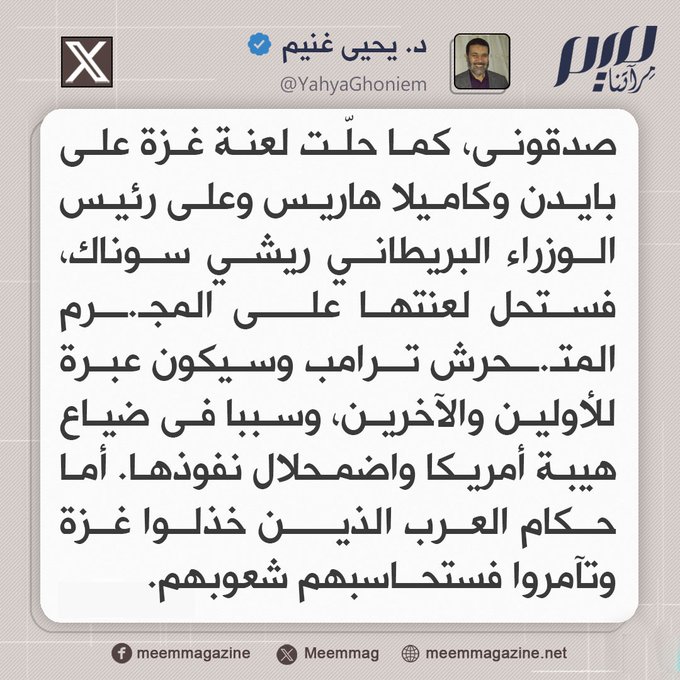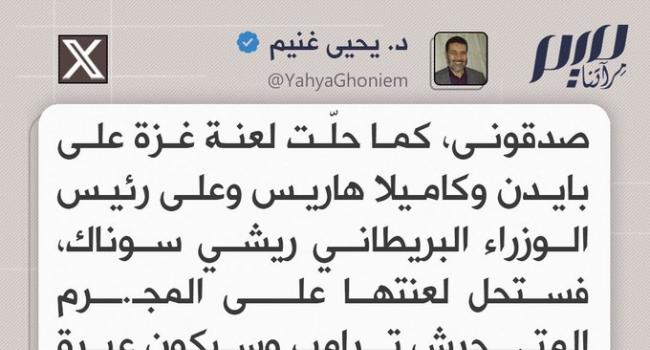 د. يحيى غنيم: صدقونى، كما حلّت لعنة غزة على بايدن وكاميلا هاريس وعلى رئيس الوزراء البريطاني ريشي سوناك، فستحل لعنتها على المجـ.ـرم المتـ.ـحرش ترامب وسيكون عبرة للأولين والآخرين.