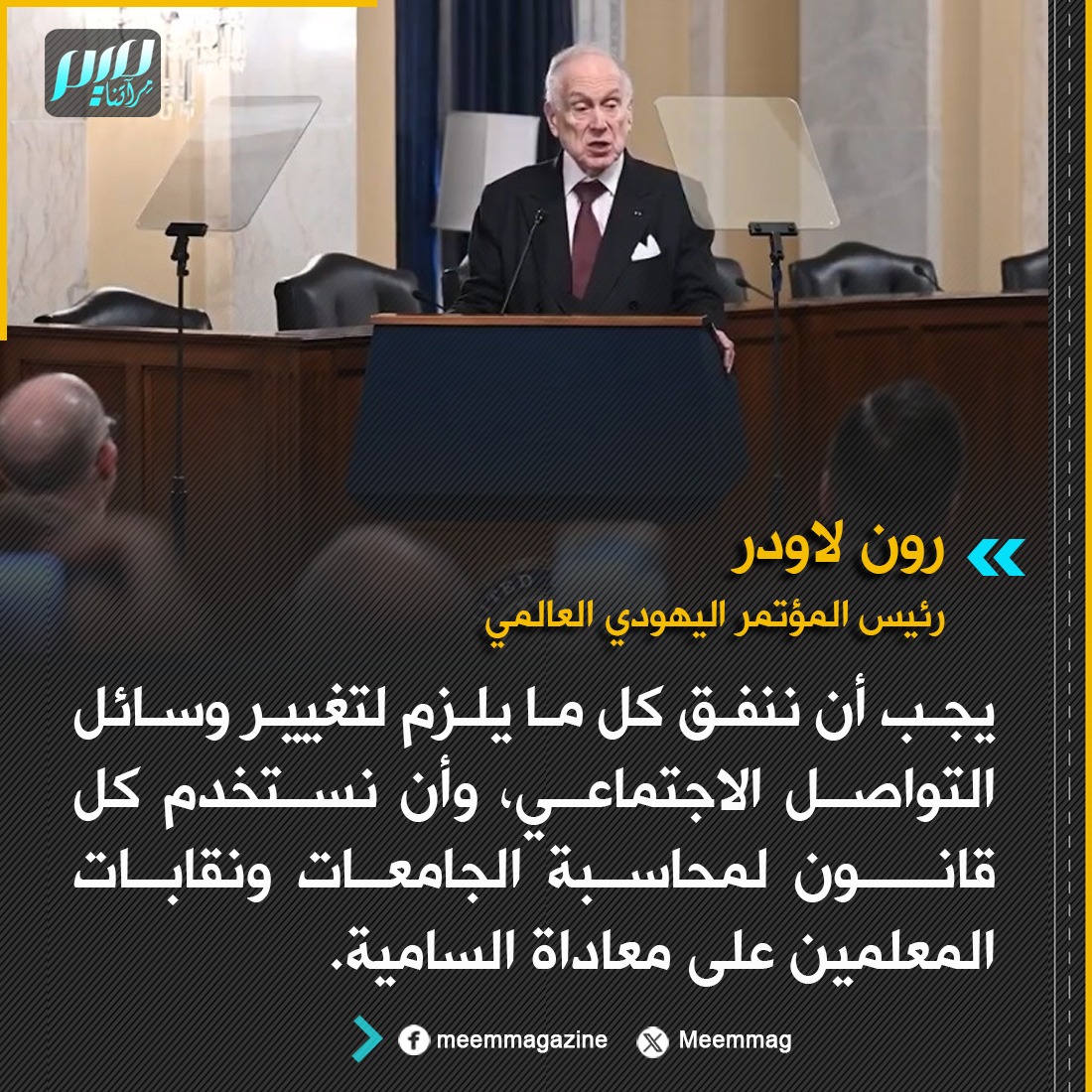 بتصريحات خطيرة خلال مؤتمر لصحيفة "جيروزاليم بوست" العبرية في واشنطن.. رئيس المؤتمر اليهودي العالمي: يجب أن ننفق كل ما يلزم لتغيير وسائل التواصل الاجتماعي، وأن نستخدم كل قانون لمحاسبة الجامعات ونقابات المعلمين على معـ ـاداة السـ ـامية.