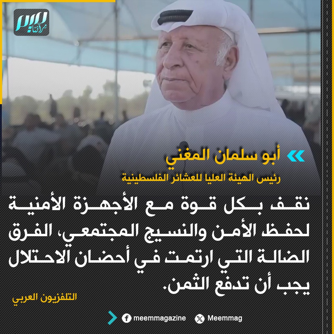 رئيس الهيئة العليا للعشائر الفلسطينية: نقف بكل قوة مع الأجهزة الأمنية لحفظ الأمن والنسيج المجتمعي، الفرق الضالة التي ارتمت في أحضان الاحتلال يجب أن تدفع الثمن.