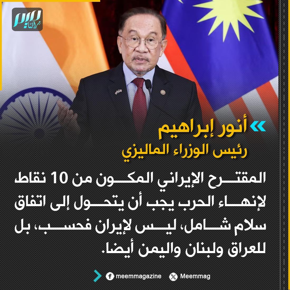 رئيس الوزراء الماليزي: المقترح الإيراني المكون من 10 نقاط لإنهاء الحرب يجب أن يتحول إلى اتفاق سلام شامل، ليس لإيران فحسب، بل للعراق ولبنان واليمن أيضًا.