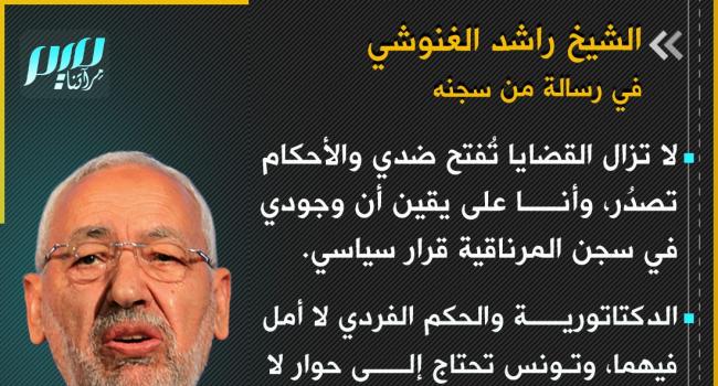 رئيس حركة النهضة التونسية، في رسالة كتبها من سجنه: شكرا لمن لا يزال يعدّ أيام اعتقالي، فقد توقفت عن العدّ منذ زمن، إلى أن يقضي الله أمرا كان مفعولا.